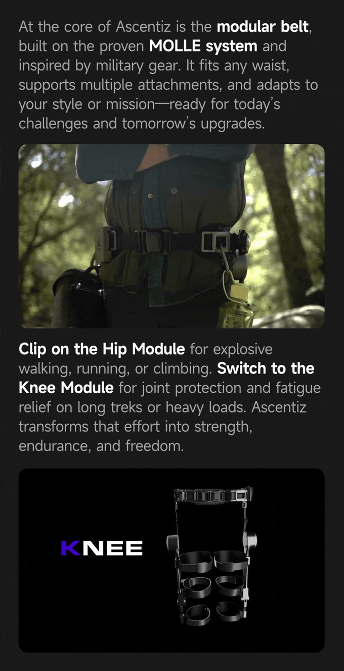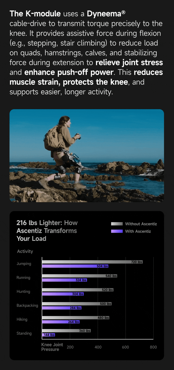 With Ascentiz, walking becomes smooth and effortless. It gives you a natural lift when you move forward and steady support when you need balance. The Hip module makes every step easier, while the Knee module keeps you stable and reduces impact. Lightweight yet reliable, Ascentiz helps you walk with confidence and comfort all day.