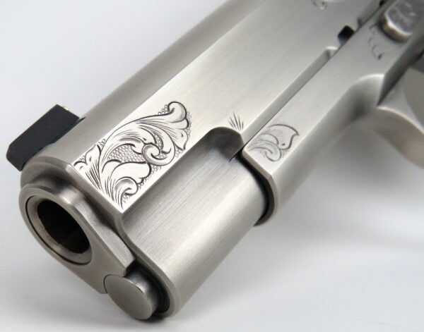- Hand Serrated Rear of the Slide and Ejector Matching the Heinie Black Rear Sight
