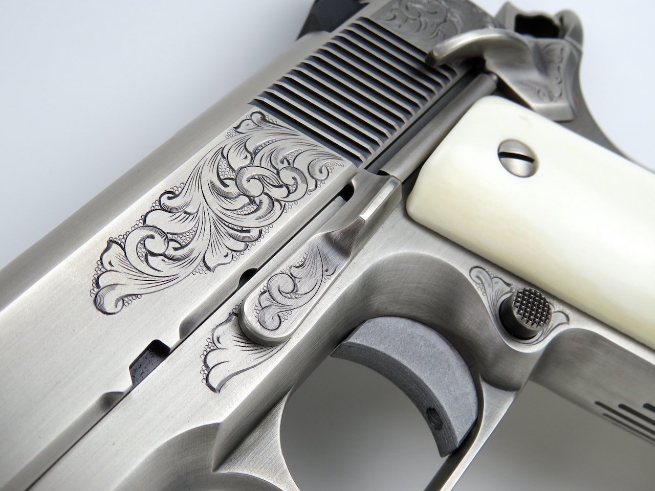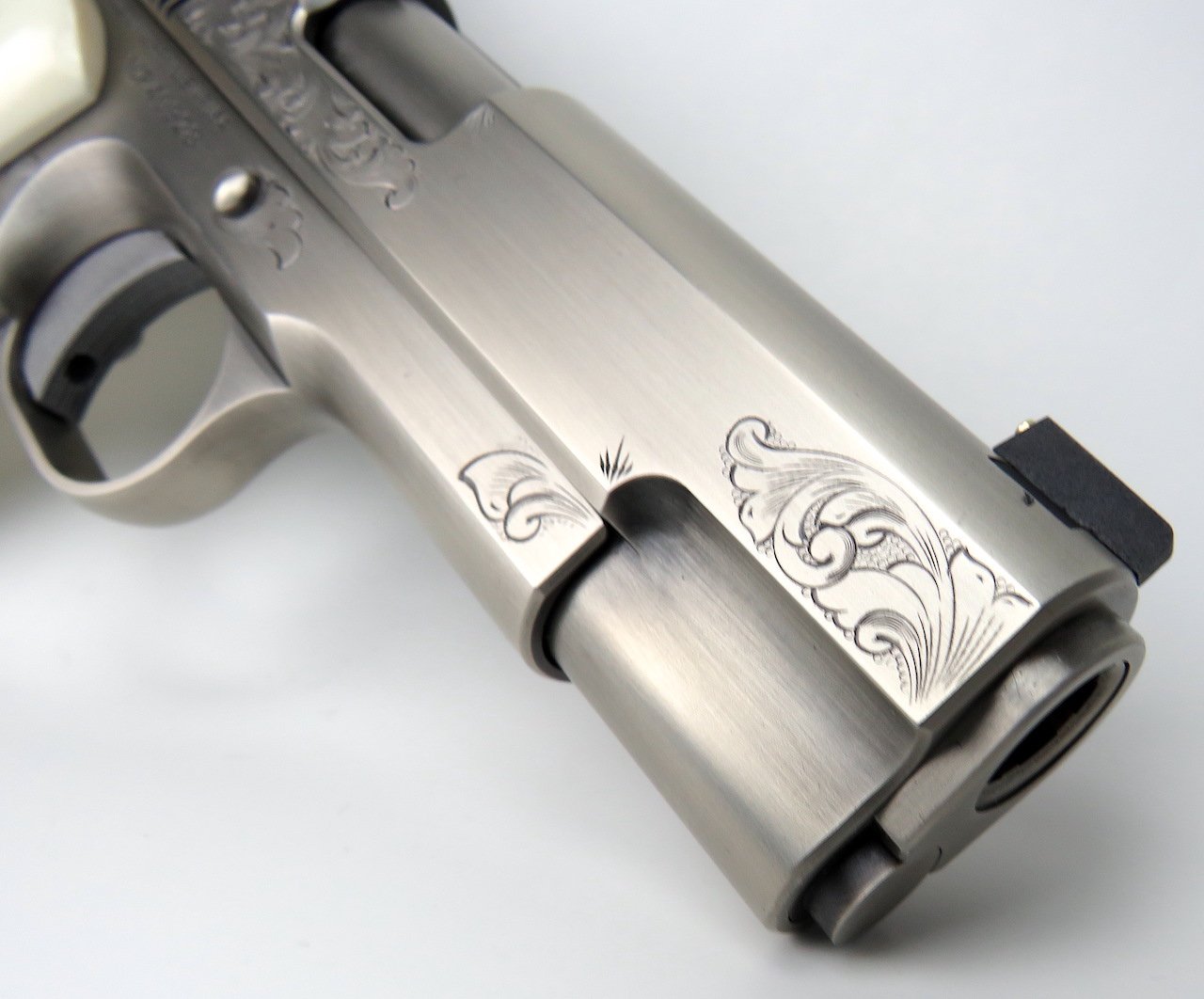 Die VIP Commander ist eine Pistole in Erbstückqualität. Sie verfügt über eine benutzerdefinierte vertikale vordere Riemen und Zacken auf dem Federgehäuse, die es ein elegantes Aussehen geben. Die Rückseite des Schlittens wurde von Hand gesägt, um mit der Heinie Black Kimme übereinzustimmen. Das Korn hat eine 14-karätige, massive Goldperle, die der Pistole Klasse verleiht. Der 4,25-Zoll-Lauf wurde gekrönt und auf dem Schlitten und dem Rahmen handgraviert. Die klassische, gealterte Nickelbeschichtung macht ihn zu einem atemberaubenden Kunstwerk. Die Griffschalen aus Giraffenknochen verleihen der Pistole ein elegantes Aussehen, das Generationen überdauern wird.