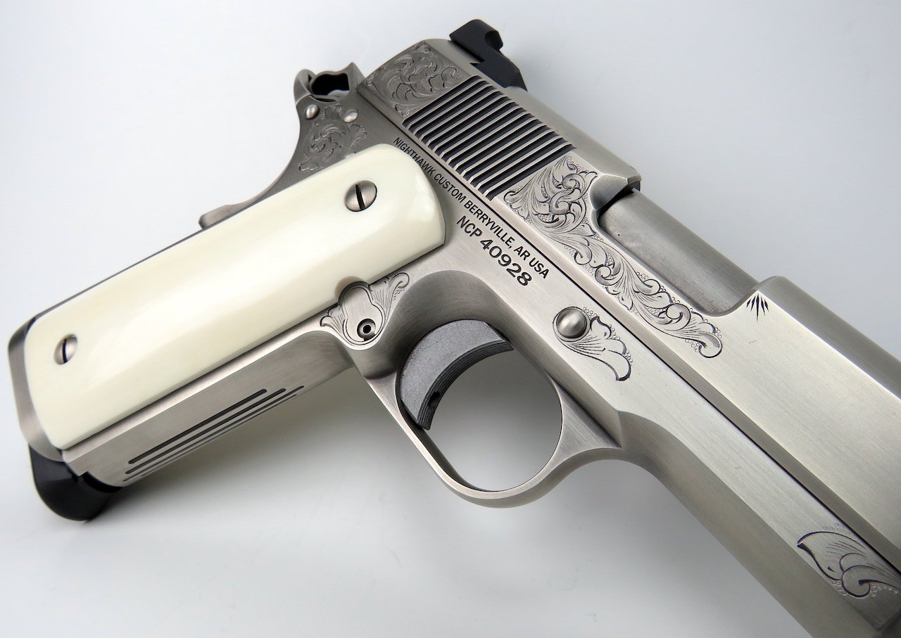 Die Commander ist eine Pistole in Erbstückqualität. Es verfügt über eine benutzerdefinierte vertikale vordere Riemen und Rändelung auf der Feder Gehäuse für ein elegantes Aussehen. Der hintere Schlitten ist von Hand gesägt, um die Heinie Black Kimme passen. Das Korn hat eine 14-karätige, massive Goldperle, die der Pistole Klasse verleiht. Der 4,25-Zoll-Lauf ist gekrönt und hat eine tiefe Handgravur auf dem Schlitten und dem Rahmen. Die klassische Antik-Nickel-Beschichtung macht diese Pistole zu einem atemberaubenden Kunstwerk. Die Griffschalen aus Giraffenknochen vervollständigen das Ensemble und sorgen für einen eleganten Look, der Generationen überdauern wird.